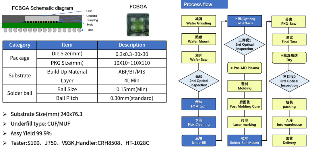 FCCSP(倒裝芯片級封裝)其主要的優(yōu)勢是產(chǎn)品的封裝尺寸接近與Die Size,采用在晶圓上做bump的技術(shù),然后通過倒裝貼片設(shè)備使芯片正面朝下。通過bump和