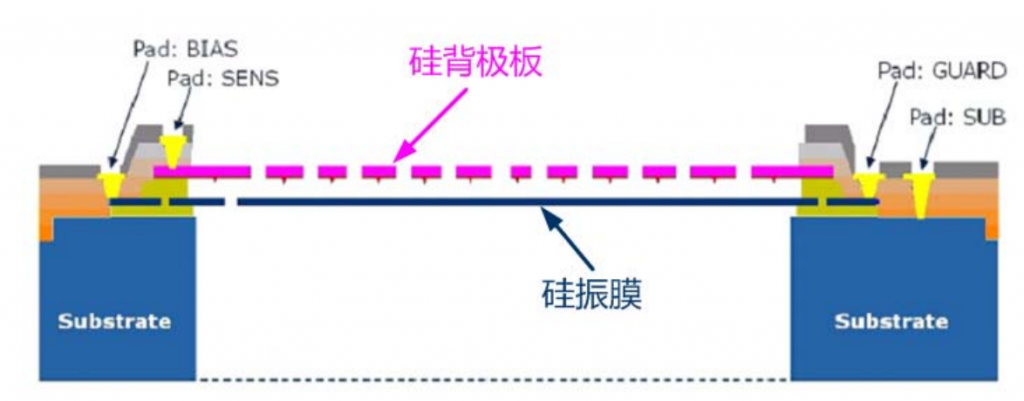 MEMS聲壓傳感器實(shí)際上是一個(gè)由硅振膜和硅背極板組成的微型電容器,硅振膜能感測聲壓的變化,將聲壓轉(zhuǎn)化為電容變化。