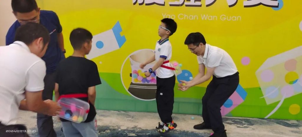 游戲規(guī)則:每組家庭10次投球機會,進球5個以上并不在同一個球桶內(nèi)即為挑戰(zhàn)成功。